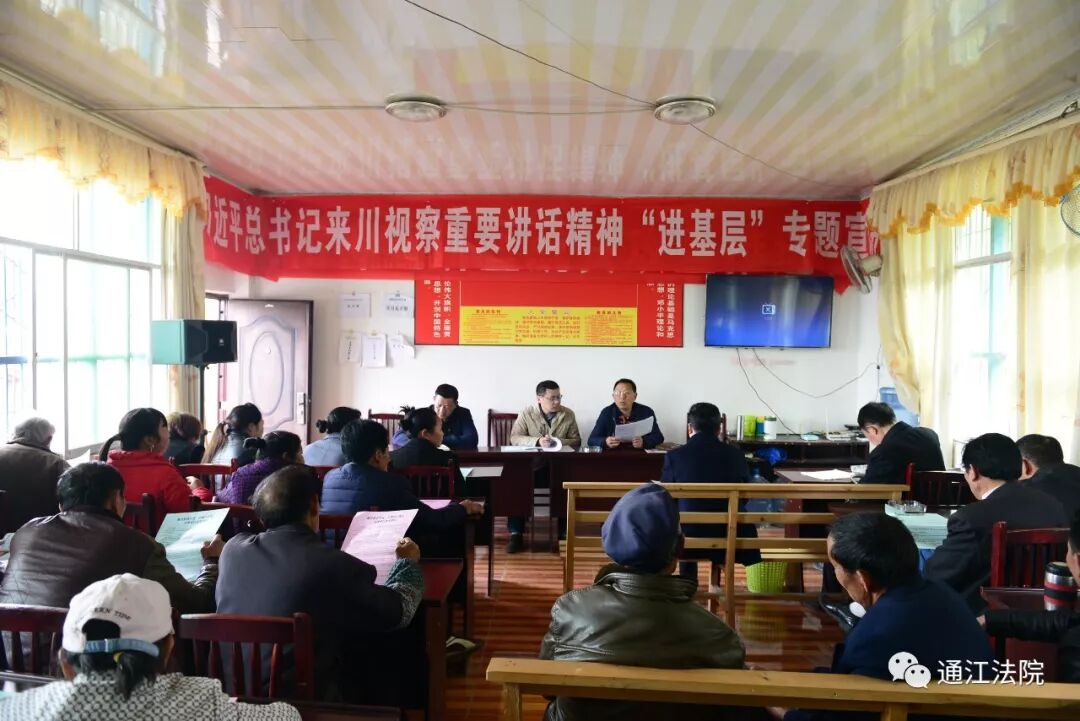 3月26日,通江县法院党组成员、副院长彭科一行,深入谷山包村进行习近平来川视察重要讲话精神“进基层”专题宣讲,村社干部、党员、村民共70余人参加了宣讲会。以群众视角,通过打比方、举例子、数据对比等方式,用深入浅出的语言解读了习近平总书记重要讲话精神、全国两会精神的实质和核心要义。按照习近平总书记“绿水青山就是金山银山”的重要指示精神,结合民、刑事诉讼的相关要求和流程,以案说法,以通江法院审理的全国首例非试点地区公益诉讼案件为切入点,强调了生态保护的必要性和重要性。